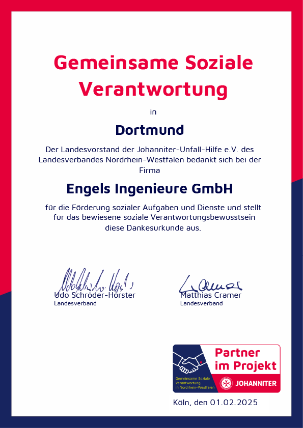 In 2023 hat die Engels Ingenieure GmbH die Auszeichnung „Arbeitgeber der Zukunft“ vom Deutschen Innovationsinstitut für Nachhaltigkeit und Digitalisierung (DIND) erhalten. Geehrt werden mit diesem Preis „innovative Unternehmen mit klarer Digitalisierungsstrategie, die Nachhaltigkeitsziele verfolgen und attraktive Arbeitsbedingungen bieten. Dabei liegt das Augenmerk auf moderner Führung und Mitarbeiterfreundlichkeit. So fließen etwa flache Hierarchien, flexible Vergütungsmodelle oder Mitarbeiter-Benefits sowie individuelle Fort- und Weiterbildungsmöglichkeiten“ in eine Bewertungsmatrix ein. Im Rahmen dieses punktebasierten Prüfsystems konnten wir uns zudem in Kategorien wie digitale Außendarstellung, Bewertungen in sozialen Medien, soziales Engagement oder moderne Arbeitsausstattung für die jährlich vergebene Auszeichnung qualifizieren. Sowohl für den langjährigen Mitarbeiter als auch die jung gebliebene Bewerberin gilt also: WIR sind bereit für die Zukunft.