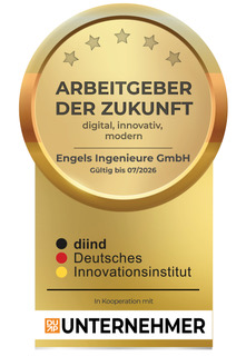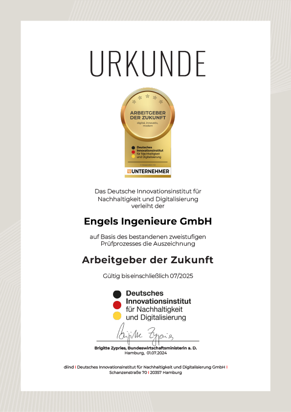 Die Engels Ingenieure GmbH wurde mit der Auszeichnung „Arbeitgeber der Zukunft“ vom Deutschen Innovationsinstitut für Nachhaltigkeit und Digitalisierung (DIND) geehrt. Mit diesem Preis werden Unternehmen gewürdigt, die durch Innovationskraft, eine klare Digitalisierungsstrategie und das Engagement für Nachhaltigkeit überzeugen.